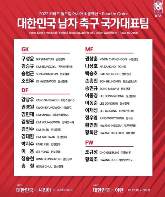 | GK | 구성윤(김천상무), 김승규(가시와레이솔), 송범근(전북현대), 조현우(울산현대) |