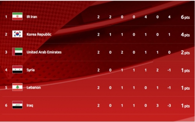 우리나라는 가장 먼저 경기를 치르며 잠시 A조 1위를 기록하였으나 이란과 아랍에미리트의 경기에서 이란이 1:0으로 승리하며 승점 9점을 기록하며 다시 조 선두에 올랐고 한국은 승점 7점으로 2위가 되었습니다.