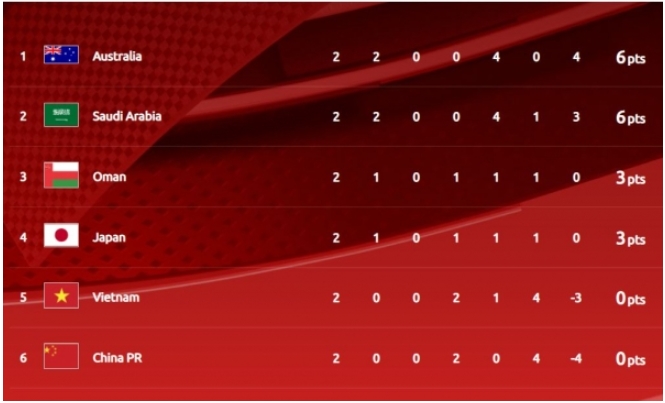 현재 B조는 호주와 사우디아라비아가 2승(승점 6)씩을 거두고 1,2위로 앞서가고 있고 오만과 일본이 1승 1패(승점 3)으로 3,4위, 박항서 감독이 이끄는 베트남과 중국은 2패로 5,6위를 기록하고 있습니다.