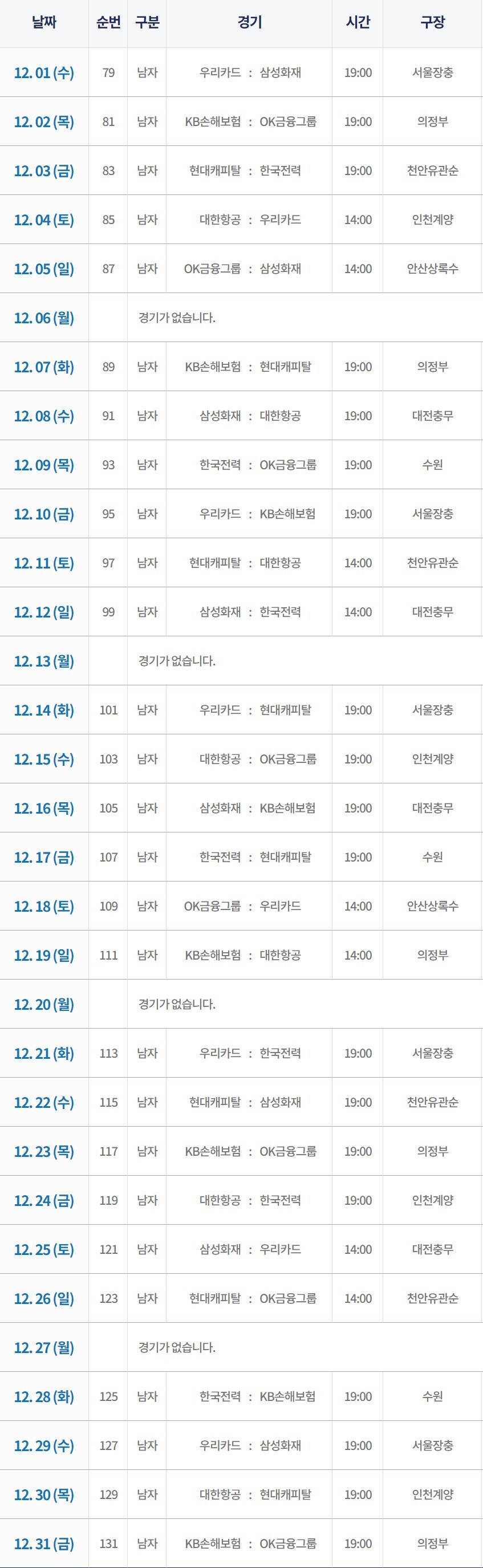 남자 프로배구 12월 경기일정은 다음과 같습니다.
