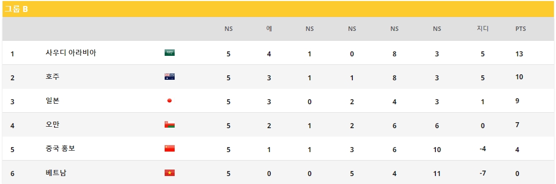 - 1위 사우디아라비아 4승1무0패, 승점 13점, 득실차+5