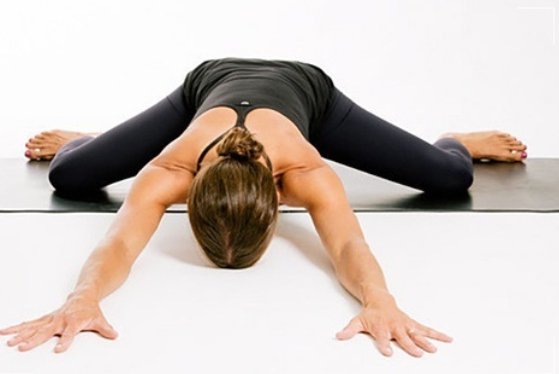 무릎을 꿇은 상태에서 상체를 숙여서 바닥에 엎드립니다. 그리고 무릎의 간격을 천천히 벌려주면서 진행하세요. 양쪽 무릎의 위치가 동일한 선상에 있도록 만들고, 손은 앞으로 뻗어줍니다. 팔뚝으로 몸을 지탱하면서 호흡하고, 엉덩이를 낮춥니다. 1분간 진행하세요.