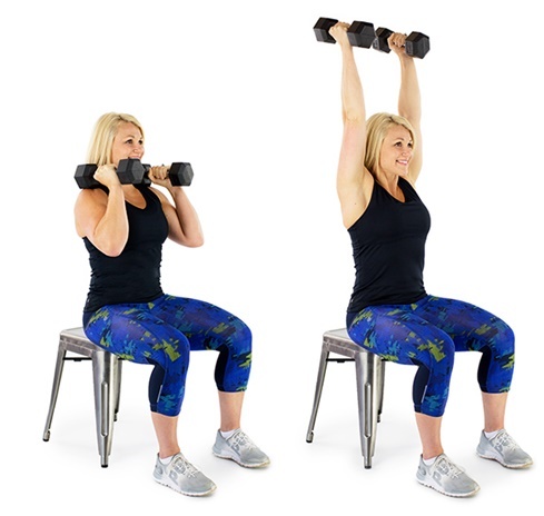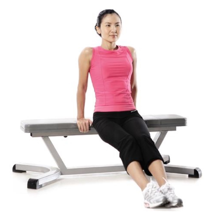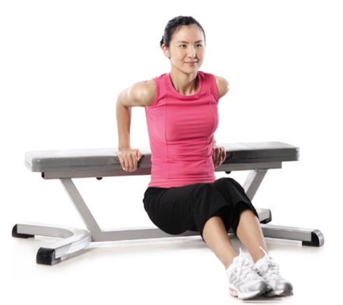 의자를 뒤에 놓고 양손으로 짚은 뒤 엉덩이를 내렸다 올리는 운동입니다. 이때 팔을 ㄱ자로 구부리면서 삼두근 쪽에 체중을 실어주는 게 핵심입니다. 한 번에 15번씩 3세트를 해주면 충분합니다.