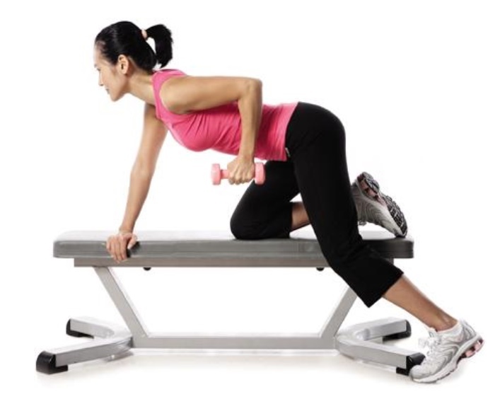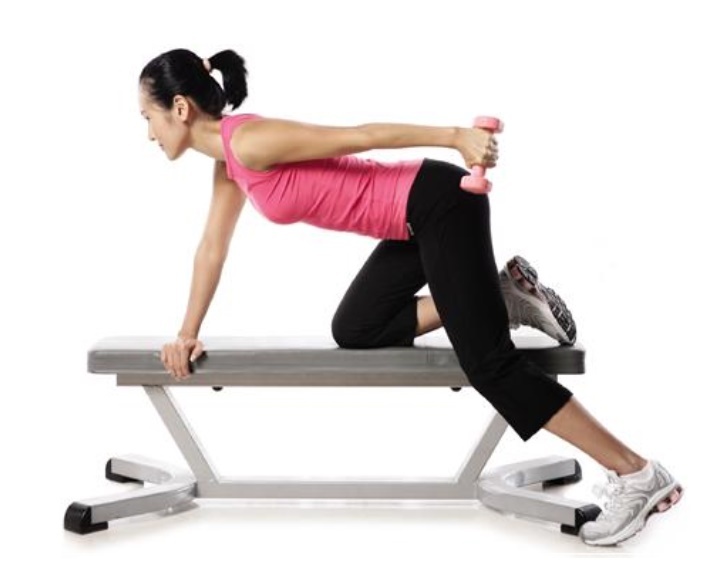백 양발을 어깨 너비로 벌리고 상체를 앞으로 약간 숙인 상태에서 덤벨을 들고 팔을 ㄴ자로 당겼다 폈다를 반복합니다.