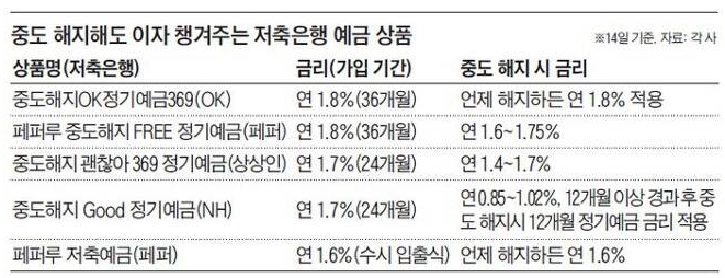 저축은행들의 '중도해지 예금' 출시는 공모주 열기 등으로 움직이는 자금을 끌어오기 위한 것으로 보입니다. 중도해지 시에도 1%대의 높은 이자가 지급되지만 저축은행별, 기간별 이자가 달라져 보유한 자산과 필요에 따른 비교 선택은 필수입니다.