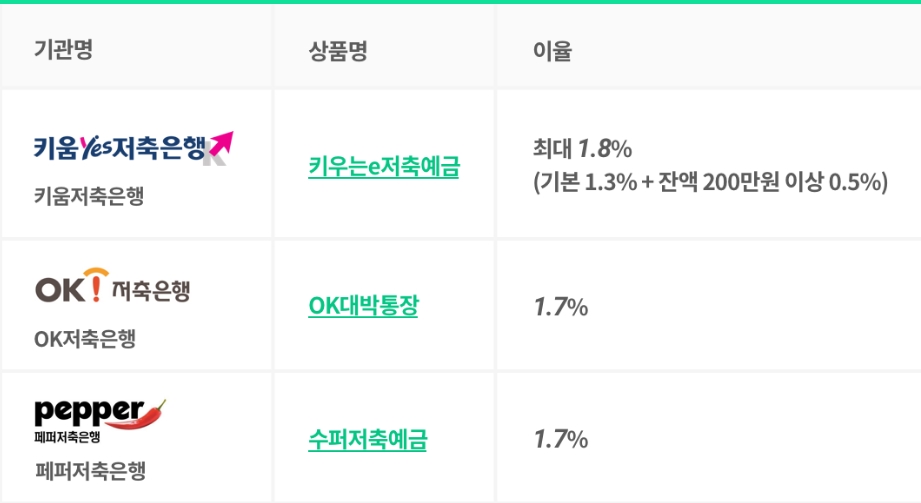 단, 중도해지 기간별로 금리는 다른데 단기자금 운용을 위해 3개월 미만 해지할 경우 OK저축은행의 금리가 1.8%로 가장 높았습니다. 이어 페퍼저축은행은 1.6%, 상상인저축은행은 1.4%, NH저축은행은 0.85% 순으로 이자를 지급하는 것으로 나타났습니다.